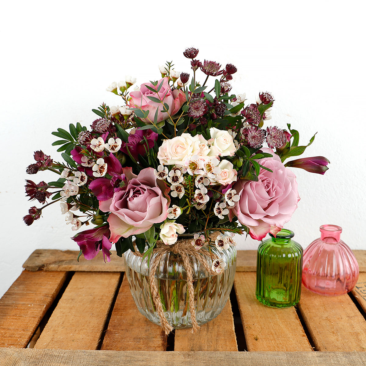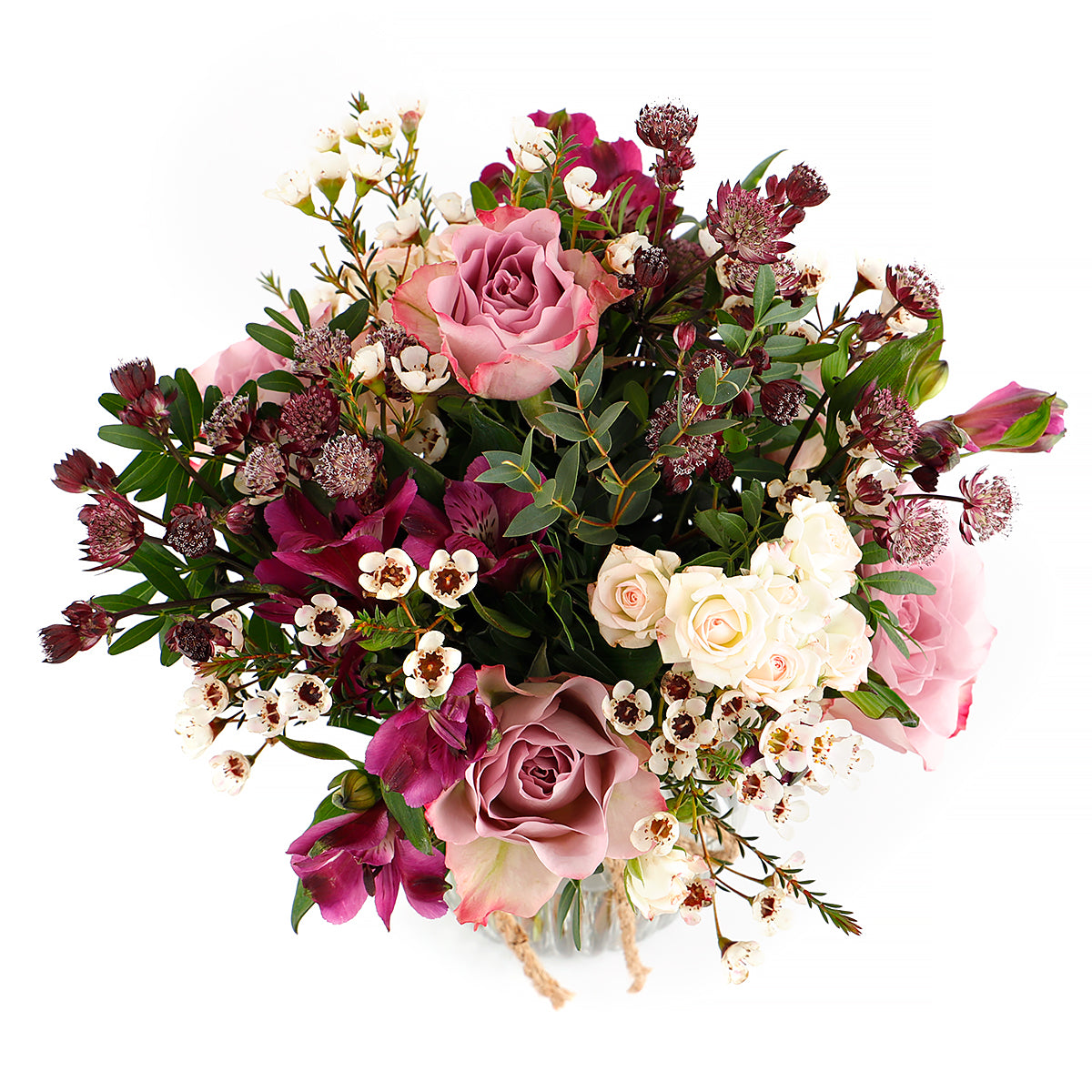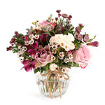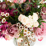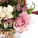 Surprise your loved one with the stunning Chelsea bouquet. The luxurious display features premium Memory Lane and pink spray roses, accented by beautiful purple alstroemeria, delicate astrantia, and white wax flower. Expertly arranged with seasonal greens in a sleek vase, this bouquet is a perfect gift for any occasion. Its rich color palette and sophisticated design are sure to impress and bring joy.