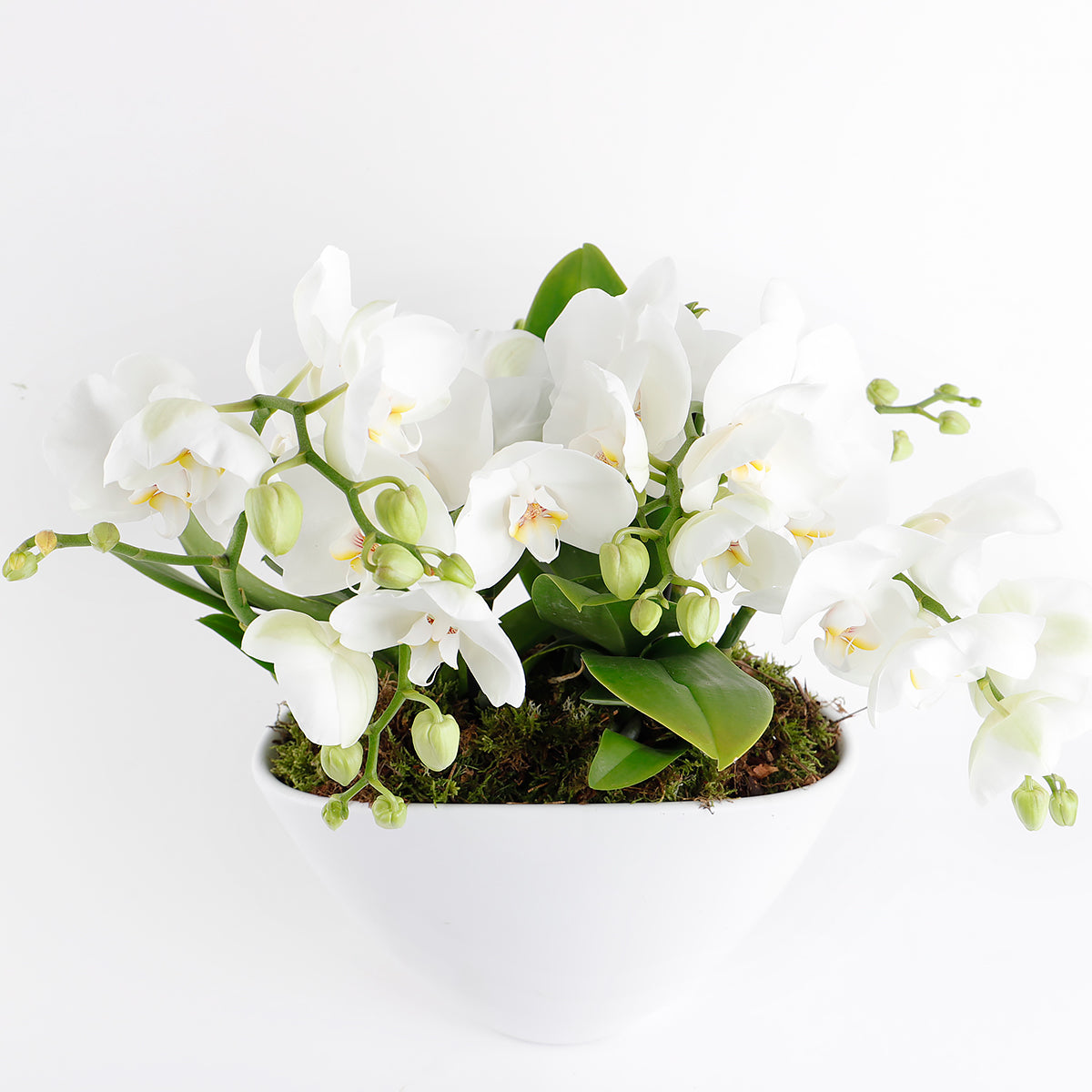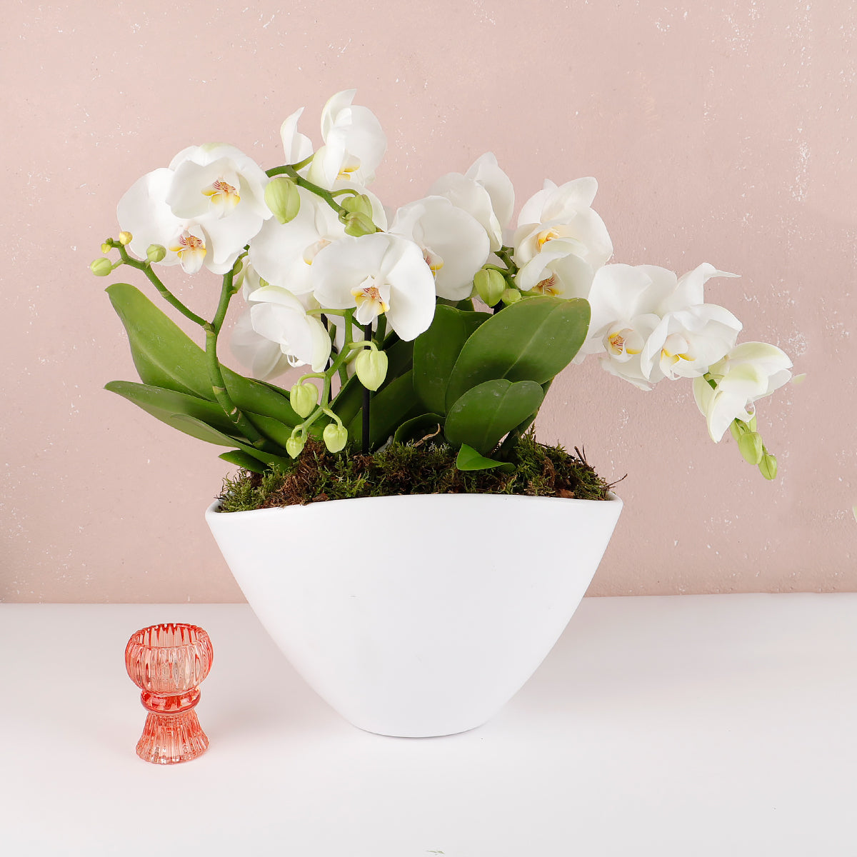 Elevate your space with the Phalaenopsis Duo Harmony, a graceful arrangement featuring two elegant Phalaenopsis plants artfully set in a ceramic vase. Designed to enhance desks, side tables, or cozy corners, this twin-stem format offers a balanced presence that’s confident yet understated.