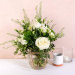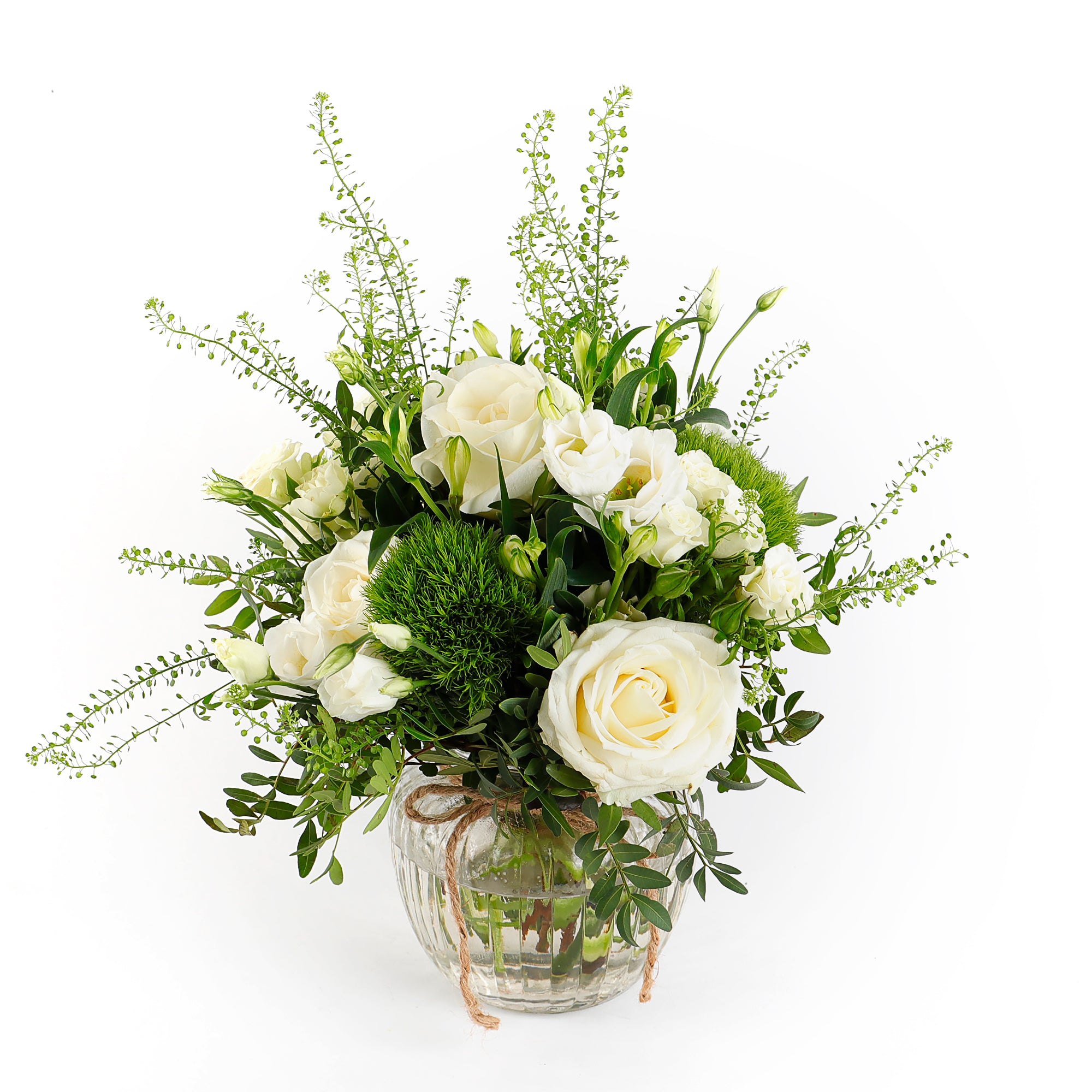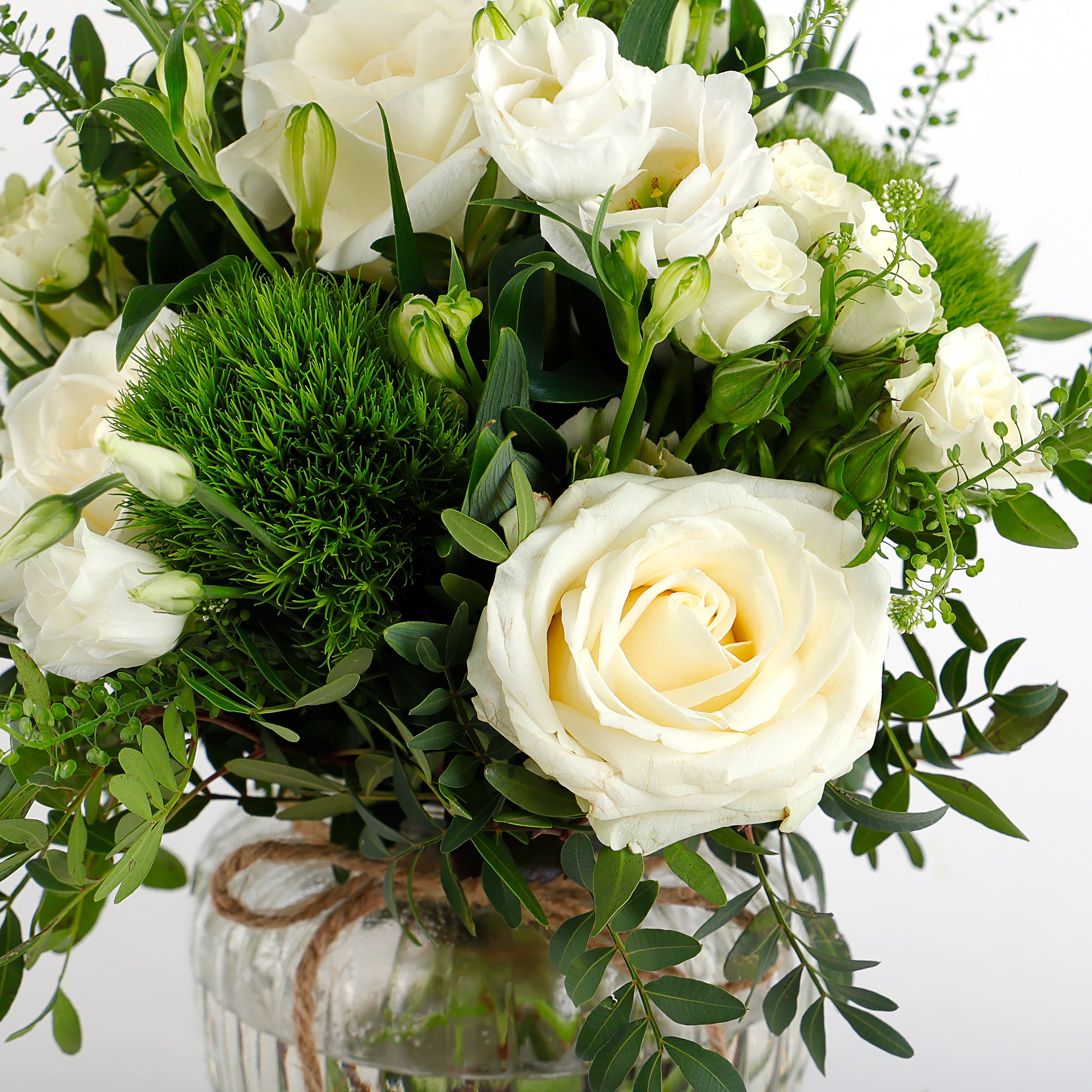 A stunning fusion of pristine white roses and vibrant green blooms, artfully arranged in a sophisticated vase. This hand-tied masterpiece exudes timeless luxury and refined charm.