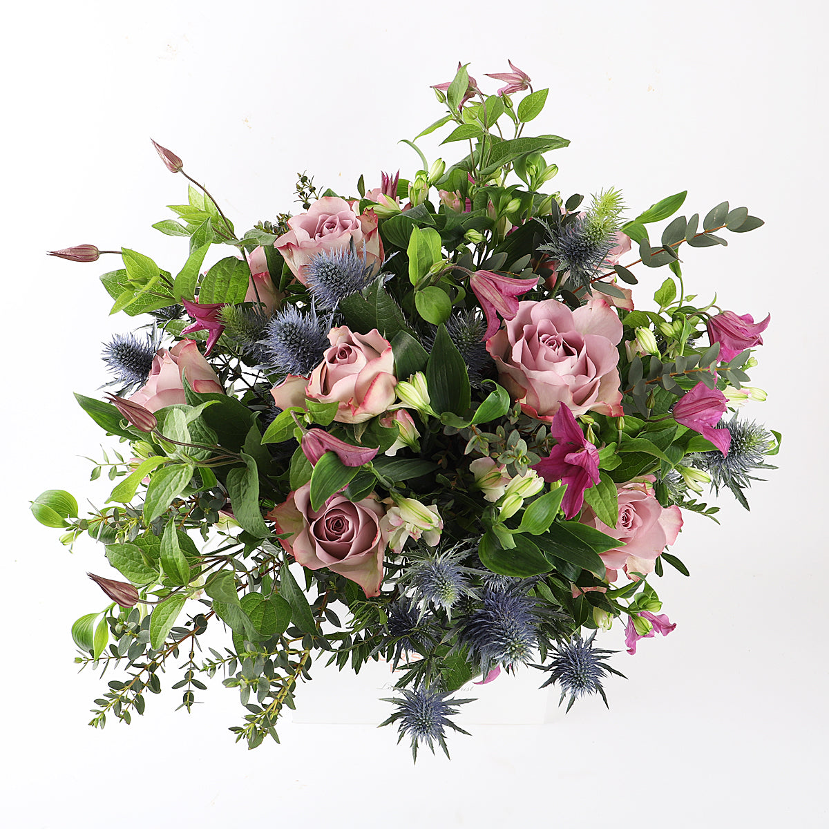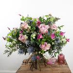 Indulge in the beautiful charm of Florence, a timeless bouquet that exudes elegance and grace. Soft and delicate Memory Lane roses in a blush hue blend effortlessly with the playful blue thistle and the whimsical clematis. The gentle pink Alstroemeria blooms dance harmoniously in between, while verdant greens bring a natural, organic feel to the arrangement.