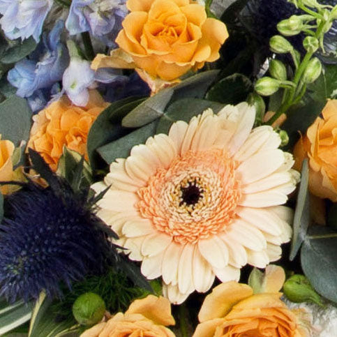 A massed tribute of white chrysanthemums with sprays available as pictured, in peaches and blues, or in your choice of colour.