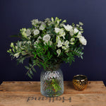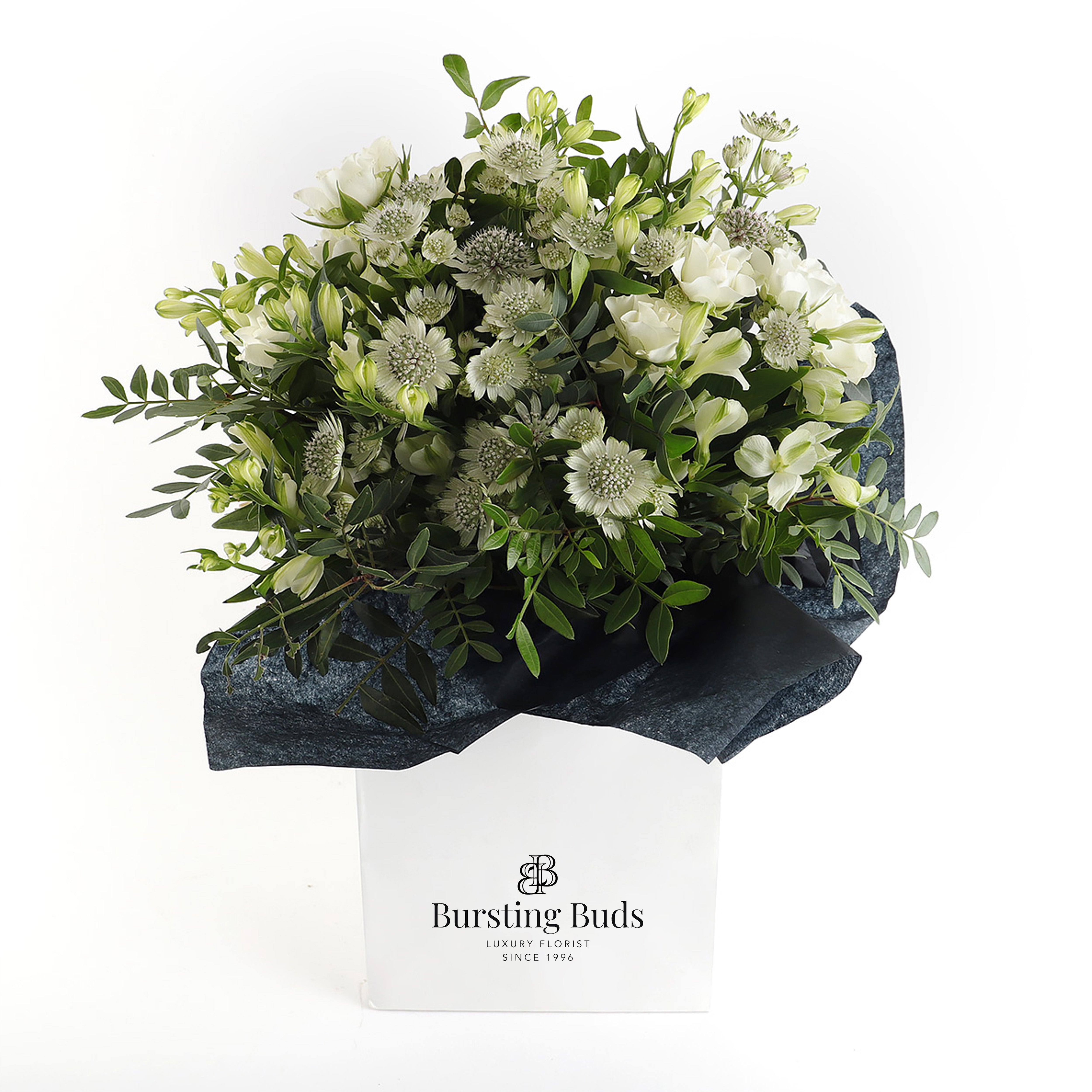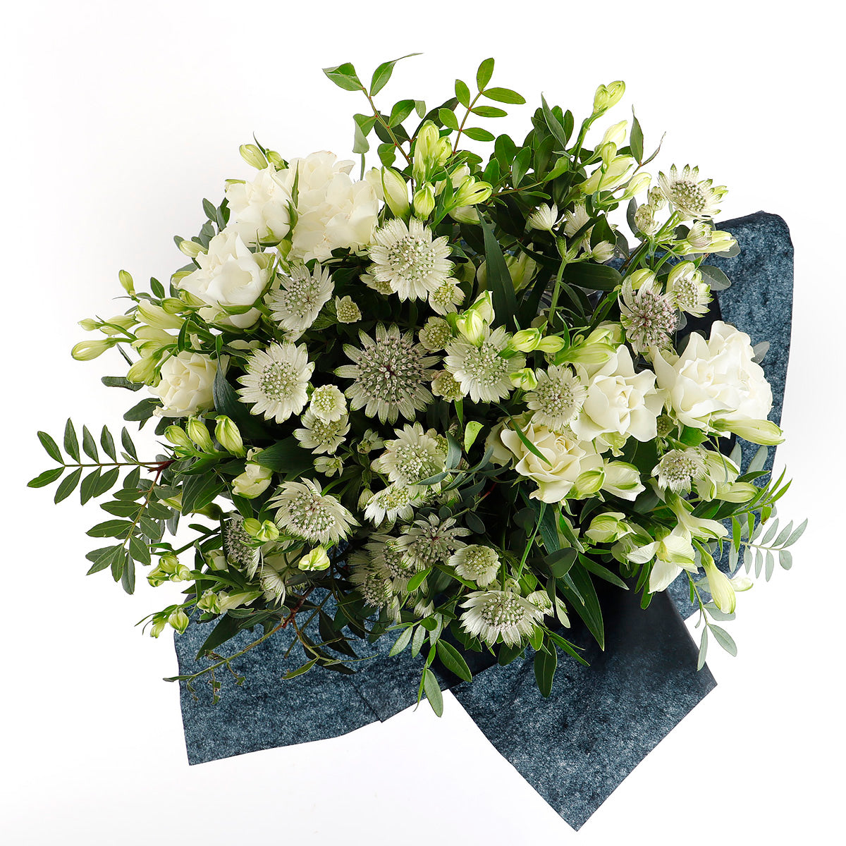This is a graceful and sophisticated handtie that captures the purity and elegance of nature. The soft, white astrantia serves as the perfect base, with its intricate star-shaped blooms bringing an air of delicacy. Complementing this, the spray roses add a touch of romance with their compact clusters of creamy white petals, while the alstroemeria introduces a subtle contrast with its elegant, slender stems and soft hues. This handtie exudes timeless beauty, making it an ideal choice for weddings, refined events, or any occasion where understated elegance is desired.