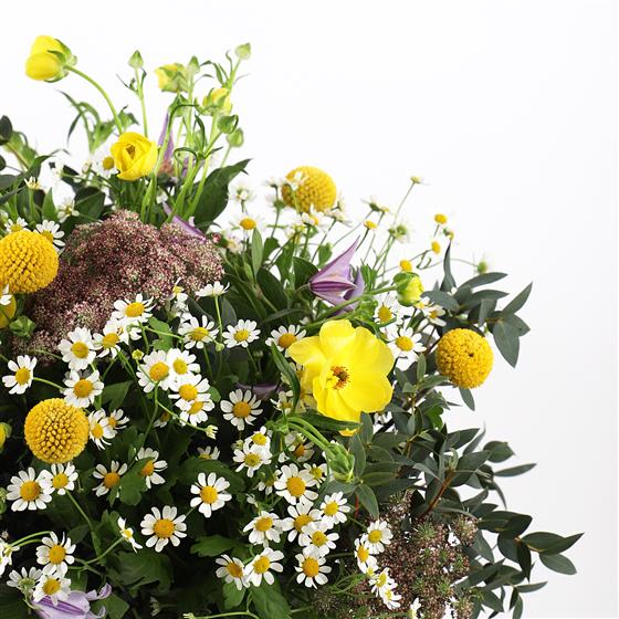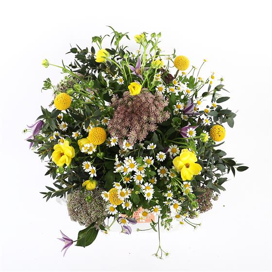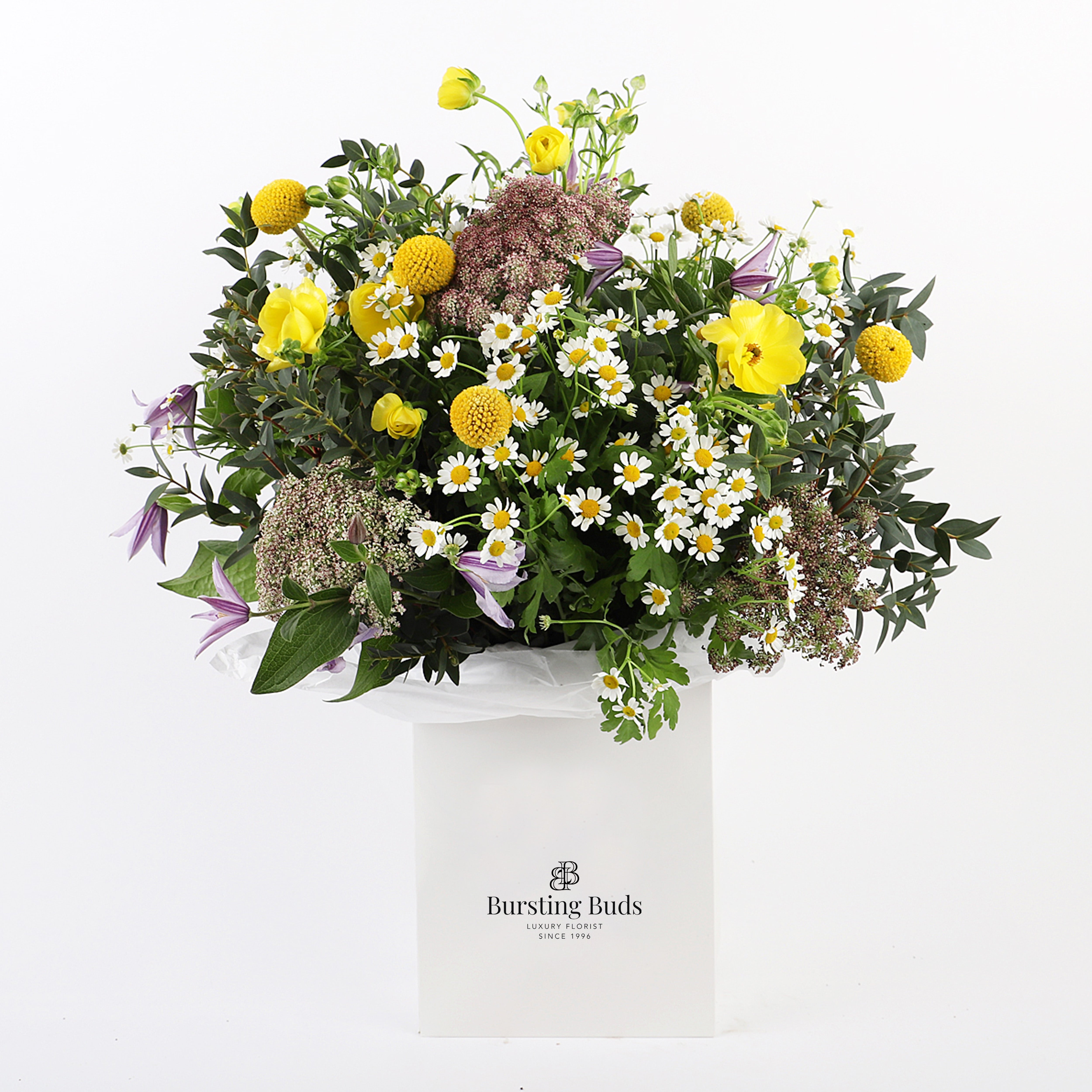 Celebrate the arrival of spring with our “Just Spring” bouquet. Featuring daisies, ammi, craspedia, butterfly ranunculus, and clematis, this stunning arrangement captures the essence of the season. The delicate combination of colors and textures creates a thoughtful arrangement, finished with seasonal greens for a natural touch. This bouquet is perfect for brightening up any room or sending a heartfelt message to a loved one.