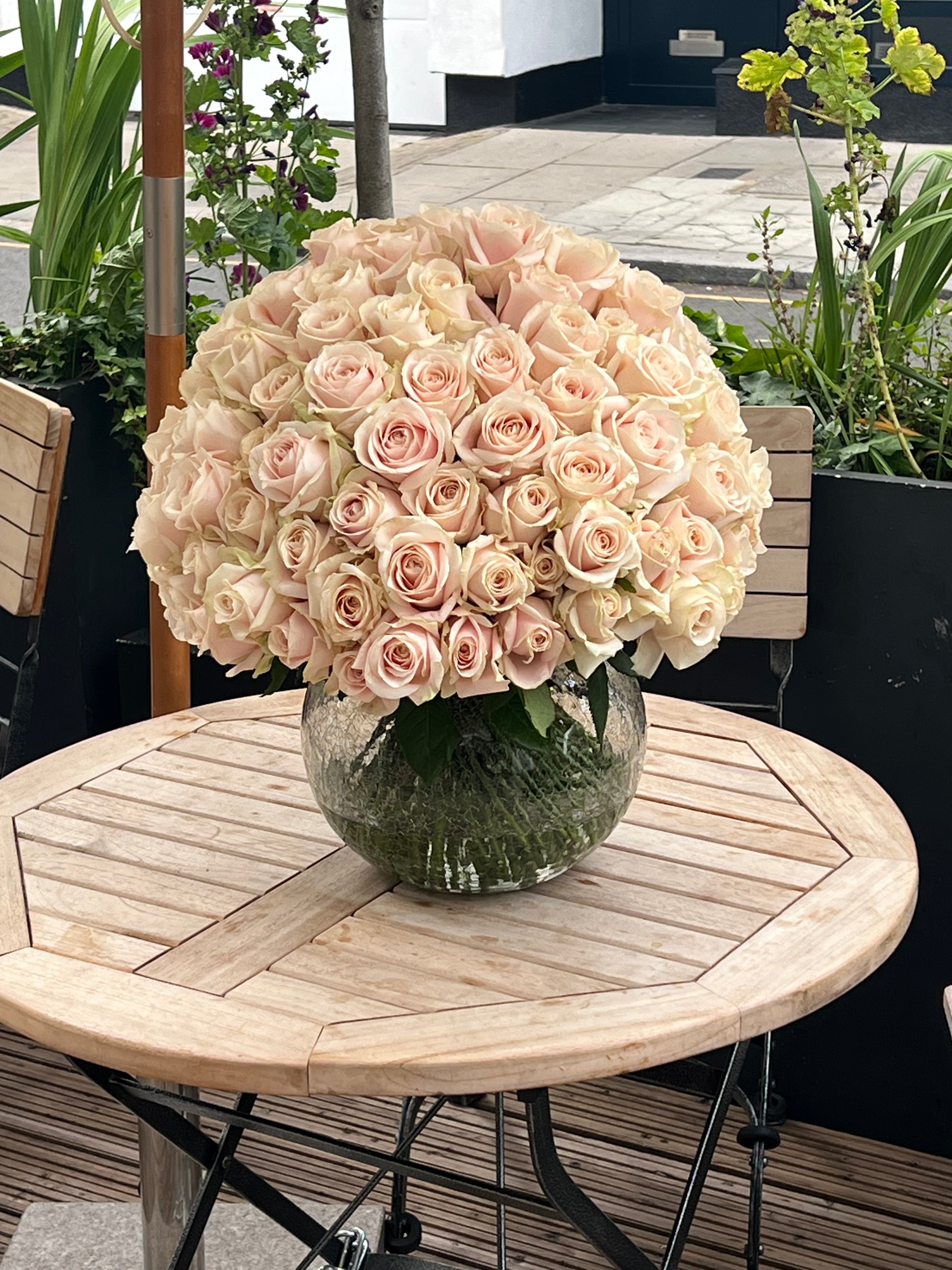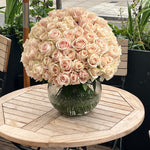 For 100 roses we keep them tall and same packing as the 12 roses, if you would like them arranged in a fish bowl (as shown in the photo), please remember to add a vase to your order.