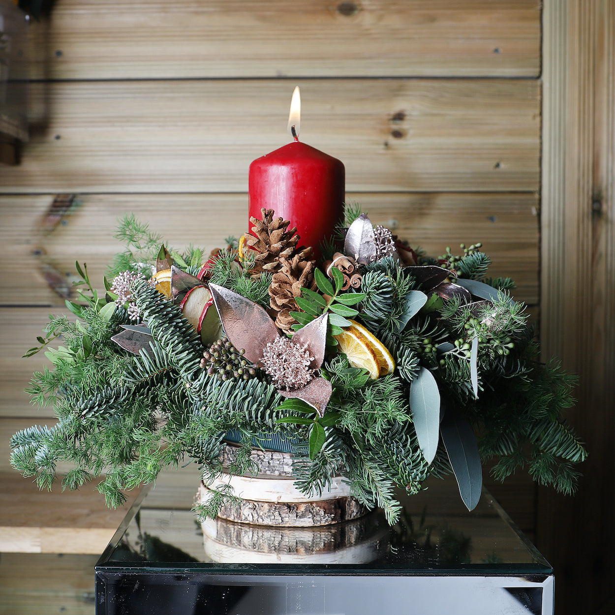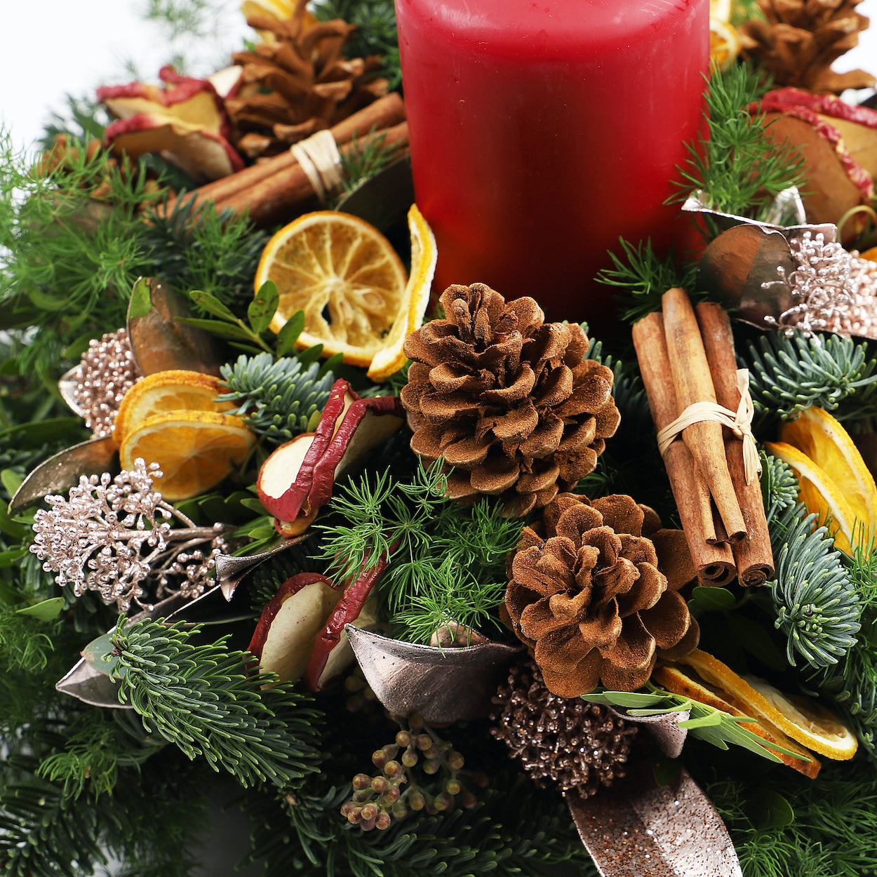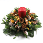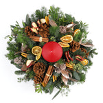 This bountiful centrepiece evokes a sense of warmth which is further enhanced through fragrant additions such as the candle, cinnamon sticks, dried lemons and apples. These beautifully aged components are carefully placed on a canvas of blue pine and skimmia to bring out their natural tones. It doesn’t get more festive than this. – 35 cm wide