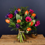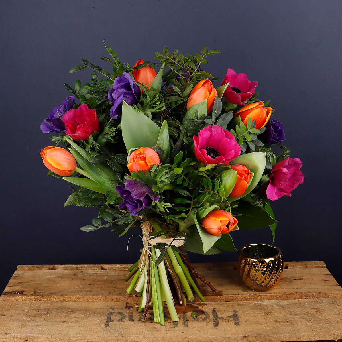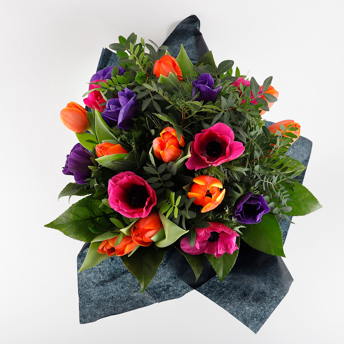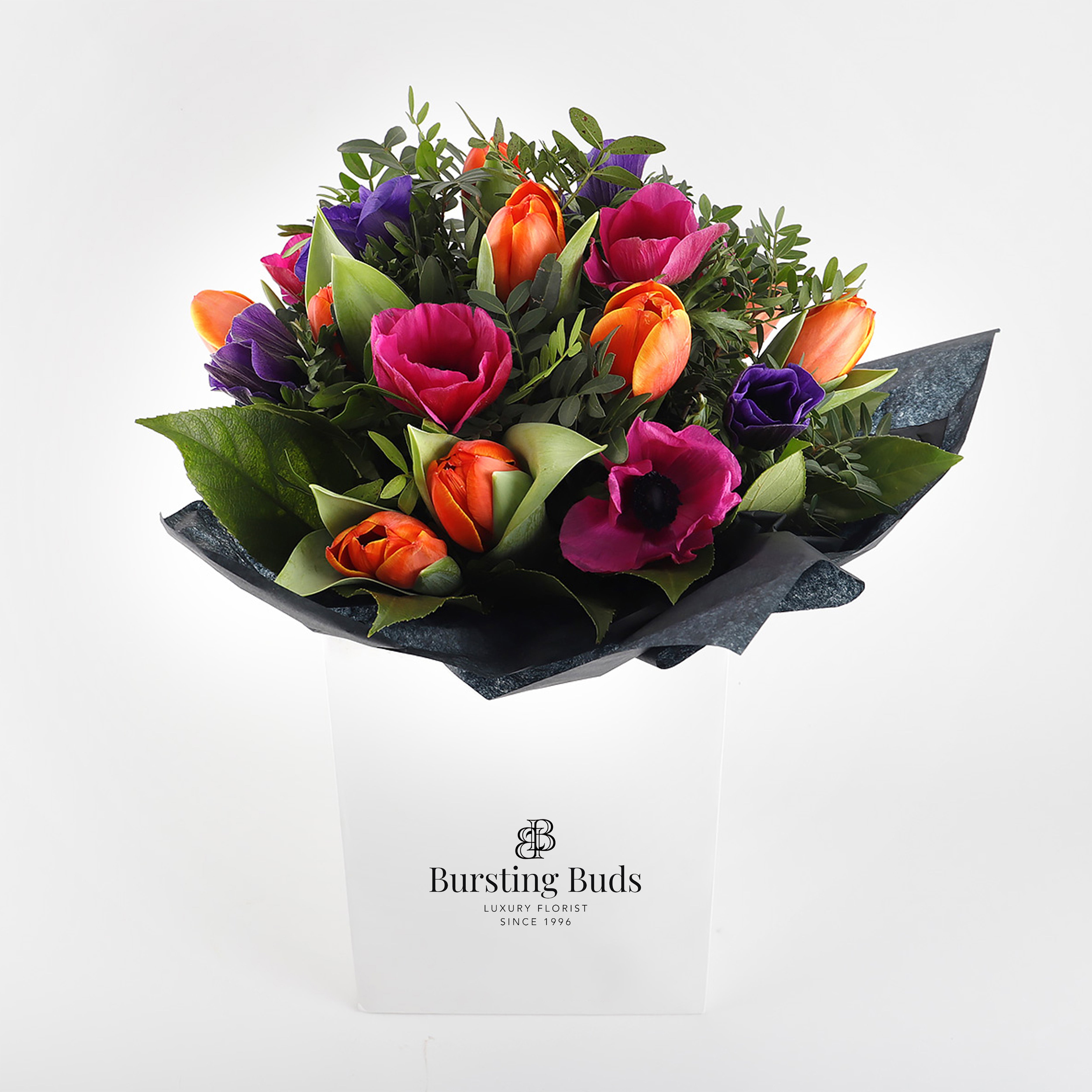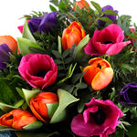This exquisite bouquet features a vibrant mix of blooms in deep pink, bold orange, and rich purple tones. The tulips and anemones are delicately nestled among lush greenery, creating a harmonious balance of elegance and vitality. The arrangement is modern yet timeless, evoking a sense of luxury and sophistication.