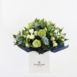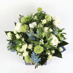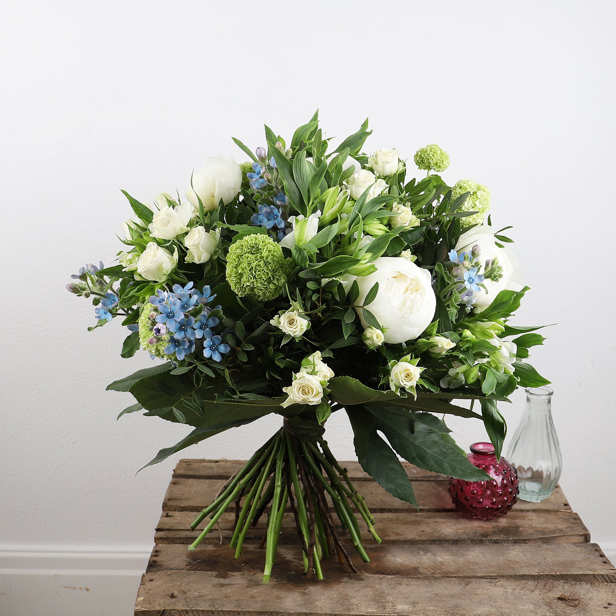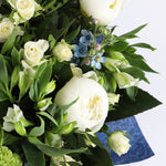 Crisp white peonies* and roses, delicate spray roses, and alstroemeria evoke a sense of serenity. Vibrant blue oxypetalum adds a touch of intrigue, while viburnum brings a natural element. This arrangement captures the essence of calm and elegance. Perfect for brightening up any space or sending a peaceful message. Let its ethereal beauty whisk away the weekday worries and fill your day with a sense of tranquility.