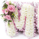 A massed white and pink tribute with a pastel pink ribbon edge and sprays including roses and lisianthus. Alternative colour options available.