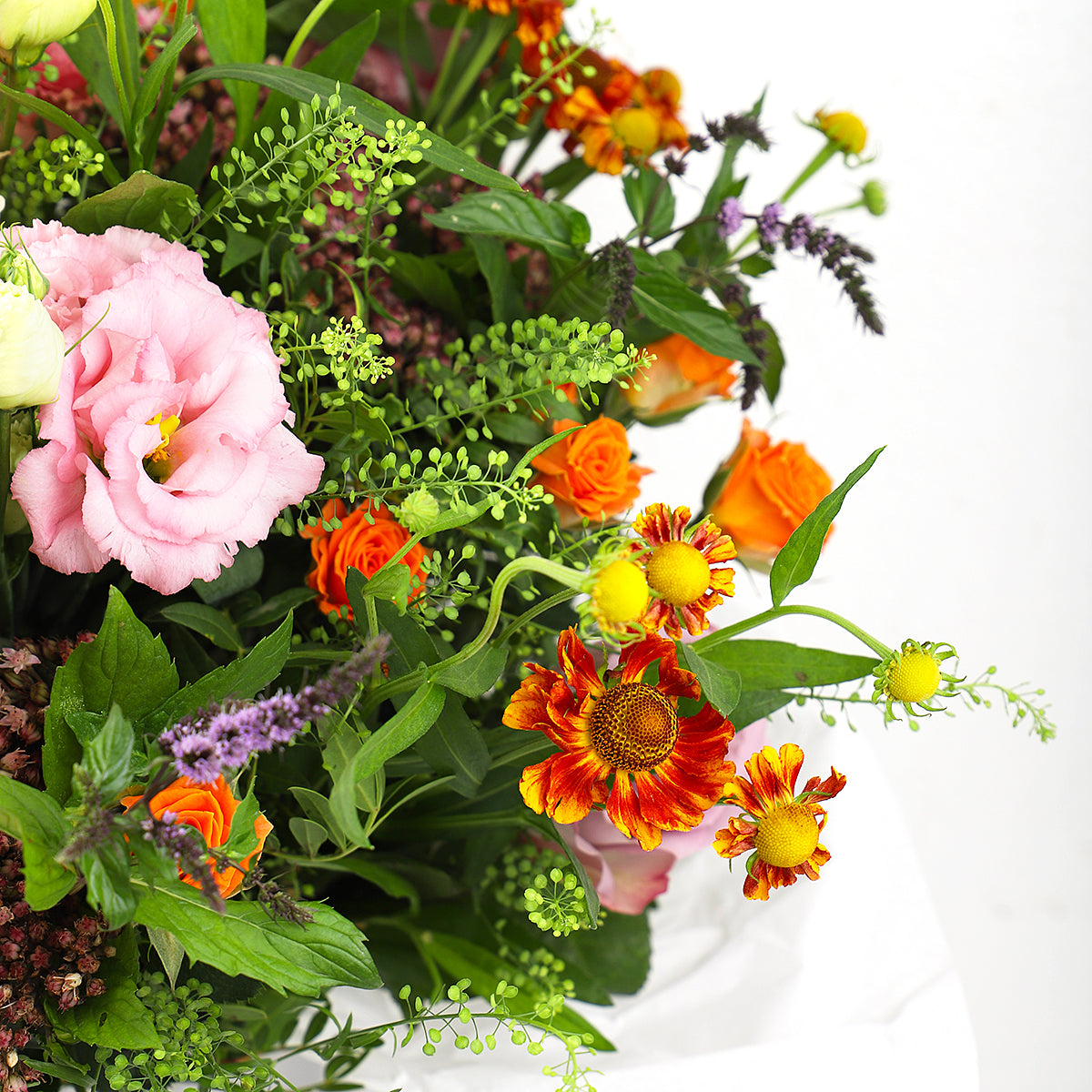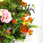 Inspired by the charm of West London’s most iconic neighbourhood, the Notting Hill bouquet is a celebration of refined beauty and effortless style. This exquisite hand-tied arrangement features a captivating blend of orange spray roses, blush pink roses, and mint lisianthus, thoughtfully accented with greenbell and lush seasonal foliage.