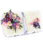 Our open prayer book has a massed white chrysanthemum base with a ribbon surround and two mixed sprays of flowers available in a range of colours.