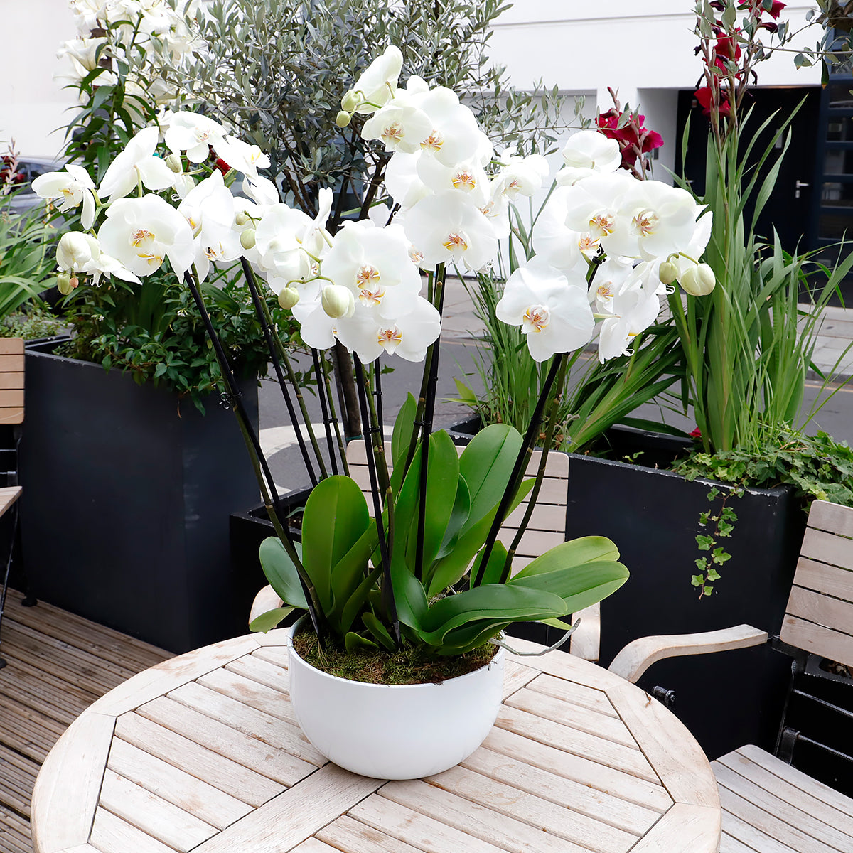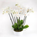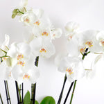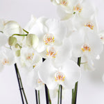 Embrace grandeur with three orchid plants, each flowering on three stems, set in a moss-accented vase. Ideal for adding vertical sophistication to consoles, boardrooms, or event tables. Vase colour and material will vary according to availability.