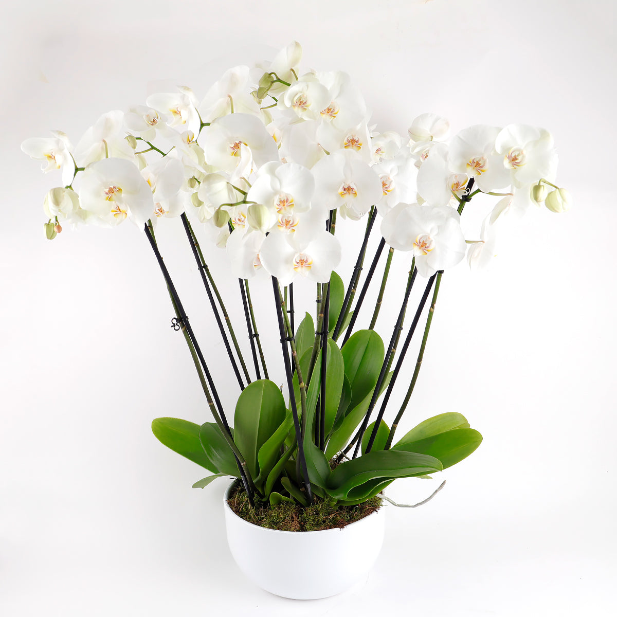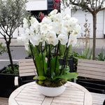 A stately ensemble of four orchid plants, each flourishing with three white stems, presented in a moss-filled vase—an exquisite centrepiece for receptions, living rooms, or sophisticated events. Vase design may differ, adding a touch of seasonal uniqueness.