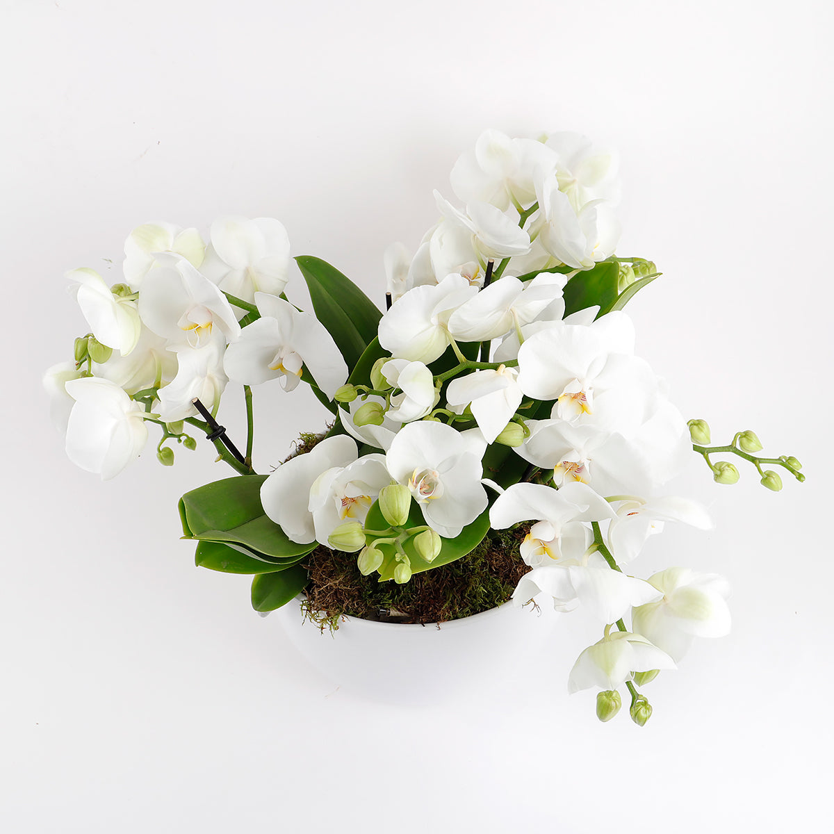 Ideal for both gifting and personal enjoyment, this arrangement combines simplicity with luxury. Phalaenopsis orchids thrive indoors under bright, indirect light, typically requiring watering every 10–14 days as the potting medium begins to dry.