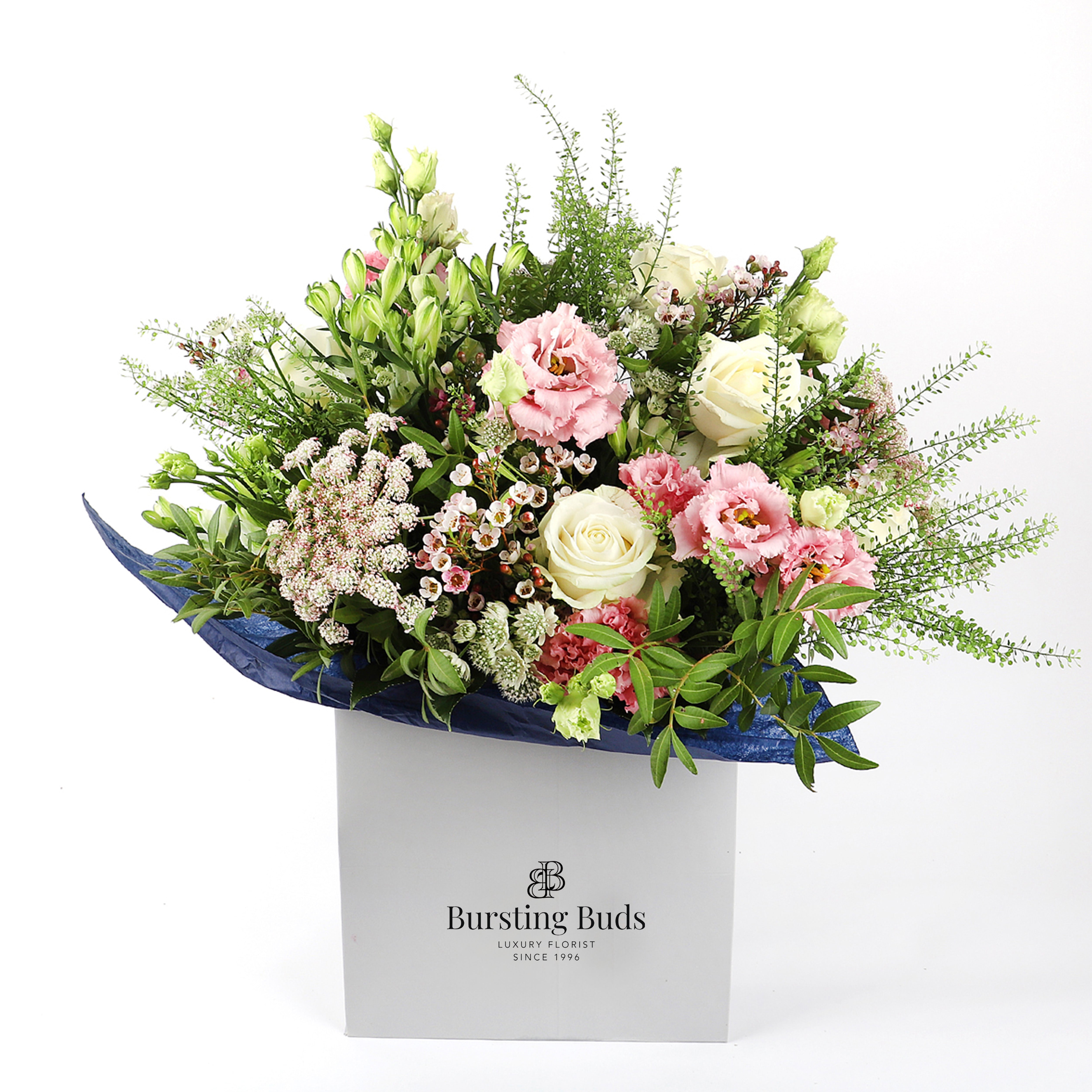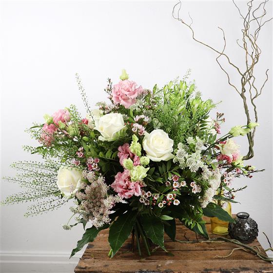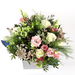An exquisite arrangement of pink lisanthus, white roses, white alstroemeria, astrantia, greenbell, ammi, white wax flower, and lush greens. This bouquet combines soft and delicate hues with textured elements for a truly stunning display. The gentle pink lisanthus and white roses create an enchanting harmony, while the accents of astrantia and ammi add a whimsical touch. Embrace the beauty and elegance of this floral masterpiece.