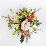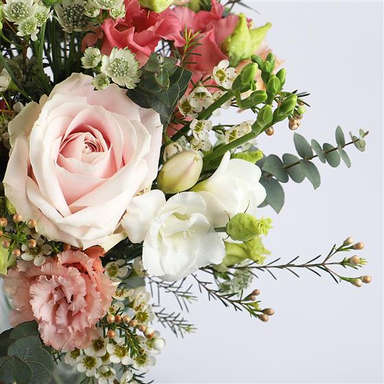 A stunning arrangement features a delicate combination of pink roses, lisiathus, and white astrantia, complemented by the sweet fragrance of white freesia and wax flowers. The soft colors of the blooms are enhanced by the lush greenery, making it an elegant and sophisticated choice. Each stem is carefully selected and arranged by our expert florists to create a breathtaking presentation that is sure to impress.