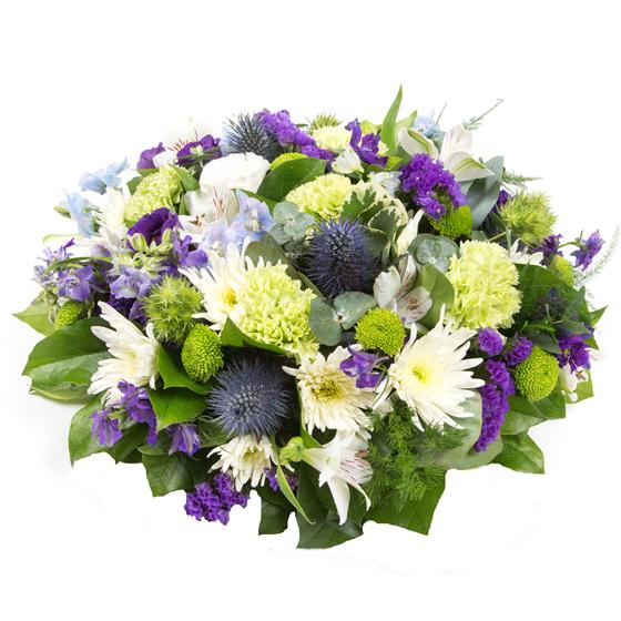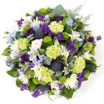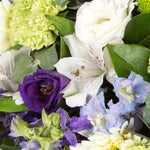 A mixed posy arrangement in limes, whites and purples, including thistles, alstromeria, statice and lisianthus.