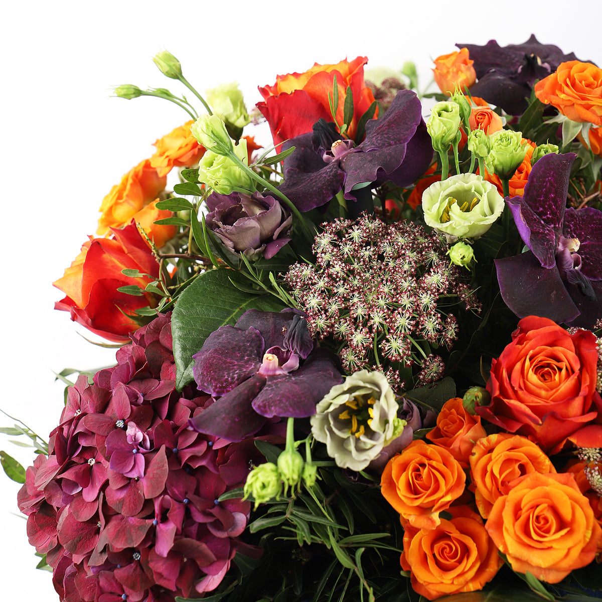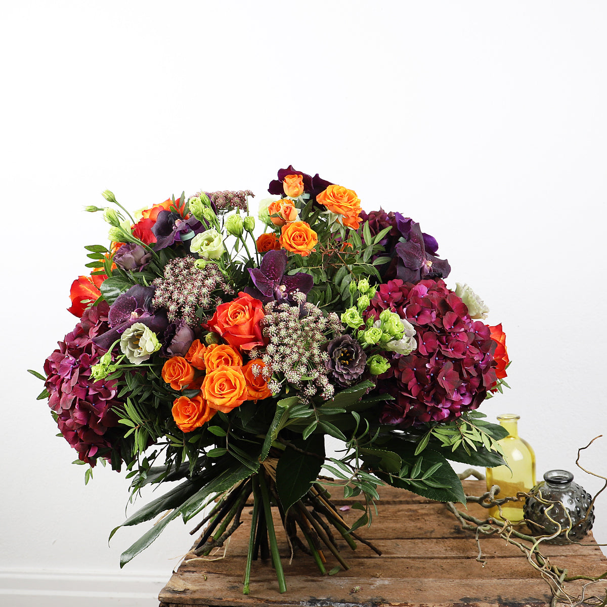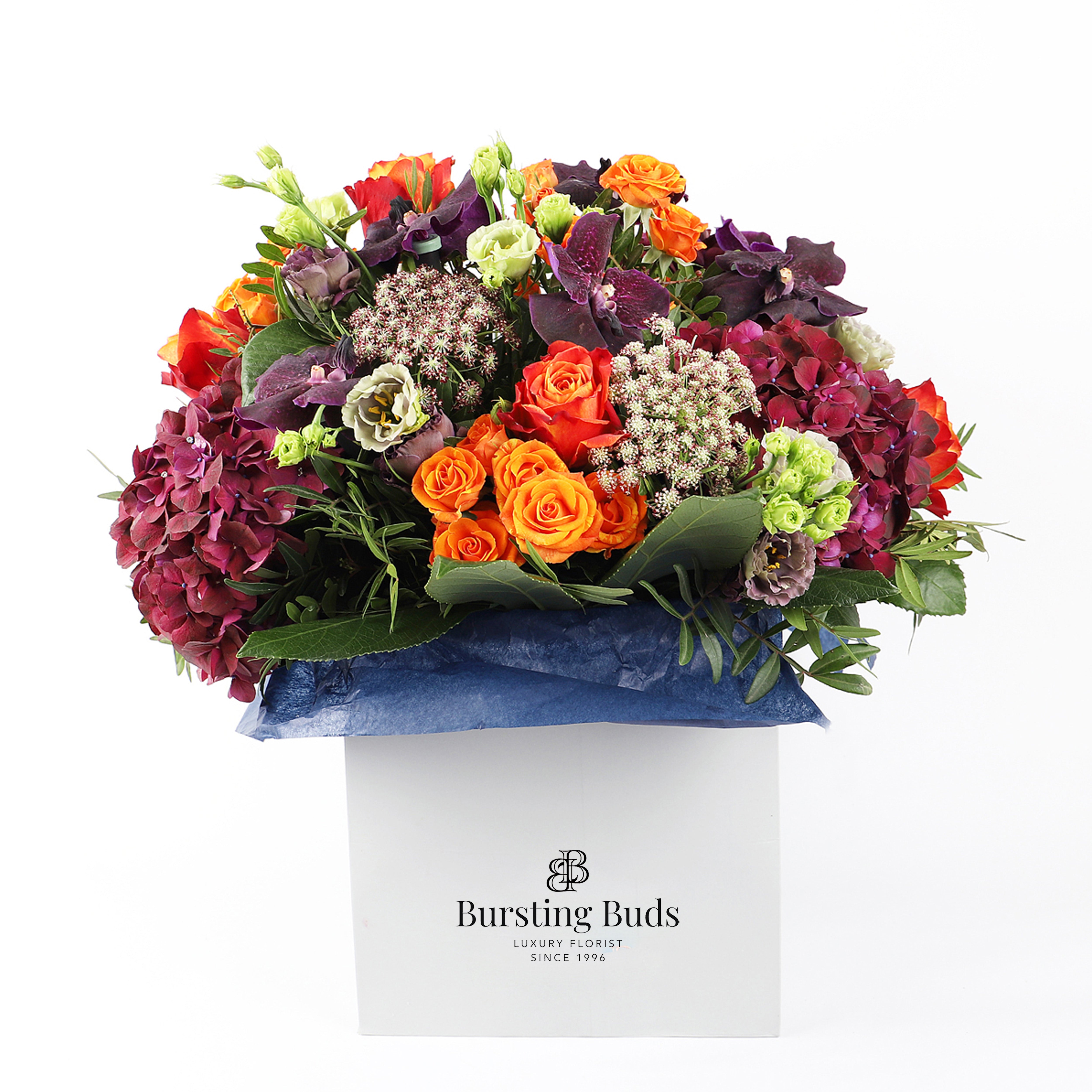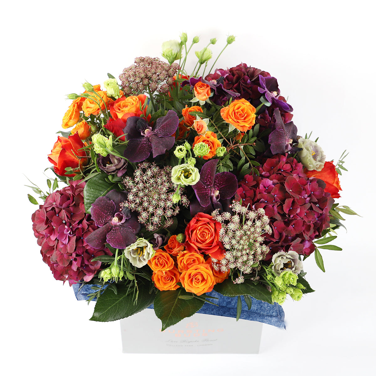 Vibrant purple hydrangea, orange spray roses, and ammi create a striking contrast, while the rich tones of orange roses and purple orchid add depth. Lush lisanthus brings a touch of elegance. This captivating arrangement is a harmonious blend of colours and textures, evoking a sense of mystery and enchantment.