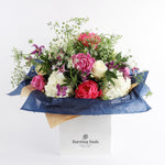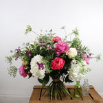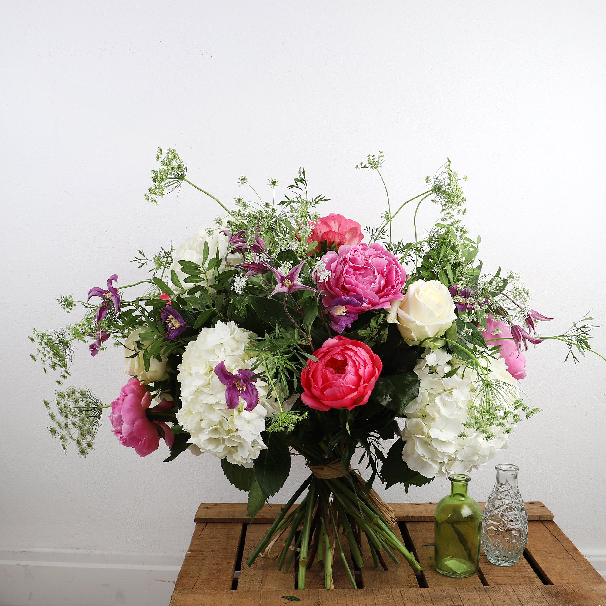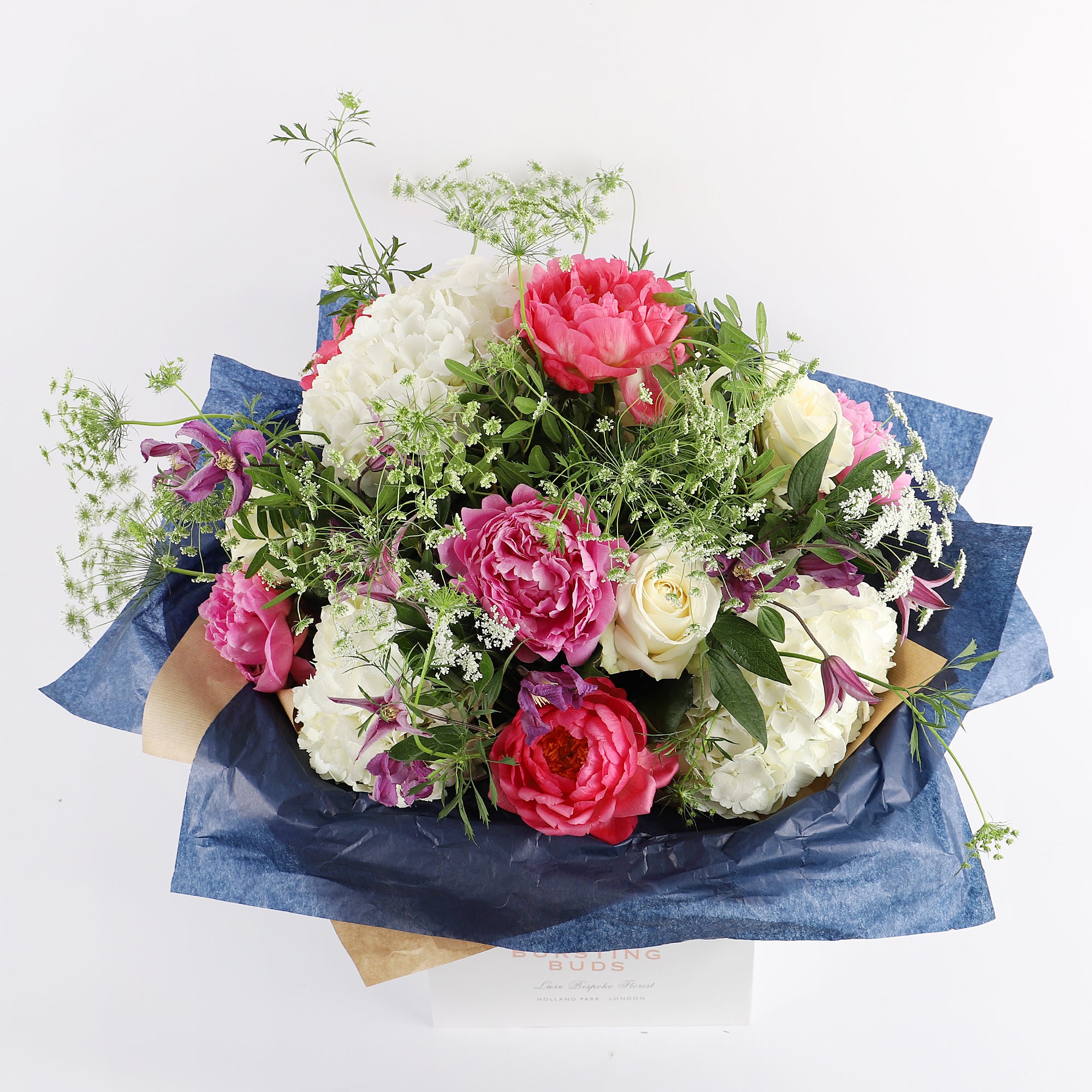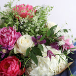 Lush white hydrangea and roses take center stage, while coral and pale pink peonies add a touch of glamour. The delicate blooms of ammi and clematis create a whimsical charm. Enhanced by lush greens, this arrangement captures the essence of celestial elegance. Superstar is a show-stopping choice. Let this bouquet shine bright and illuminate any space with its dazzling beauty.