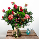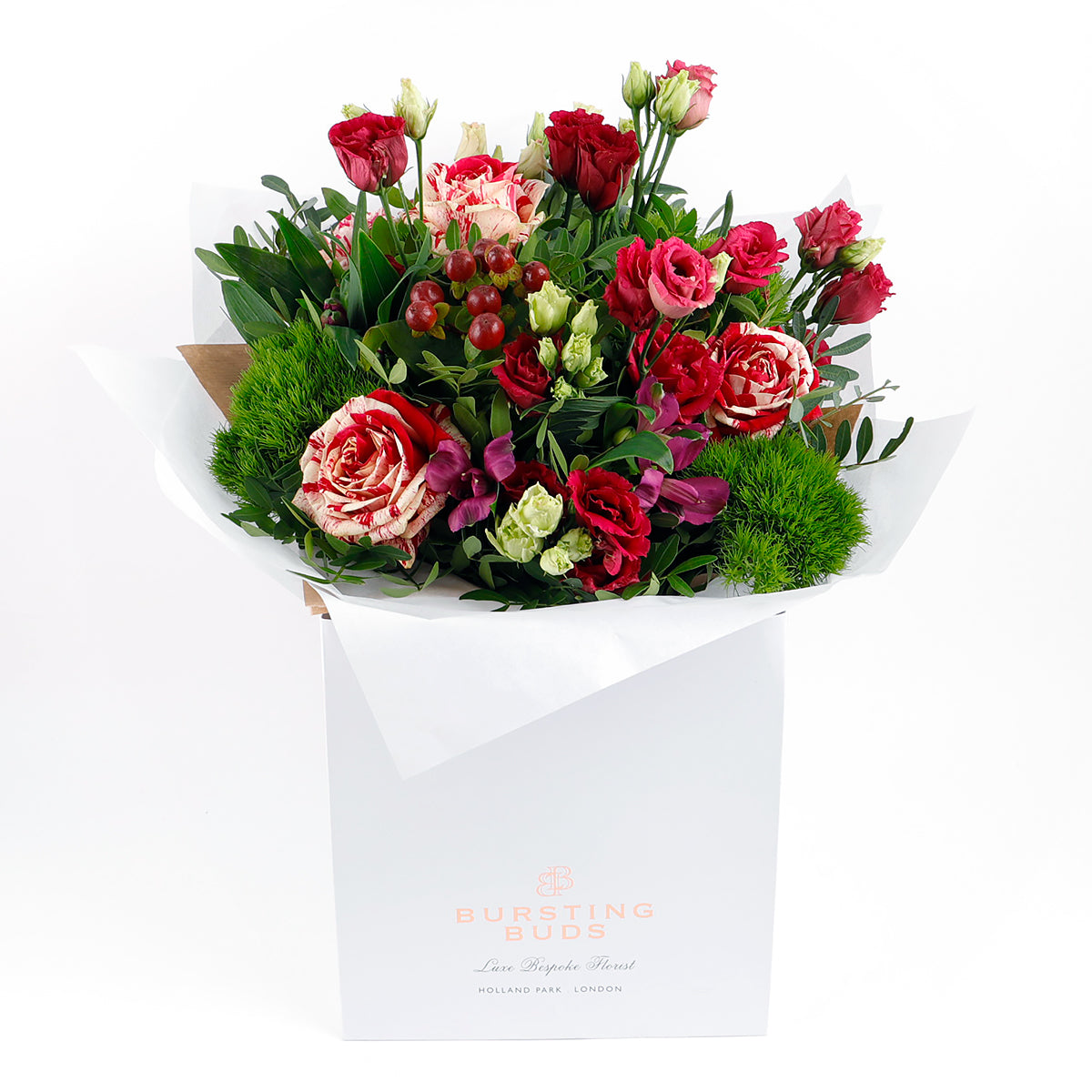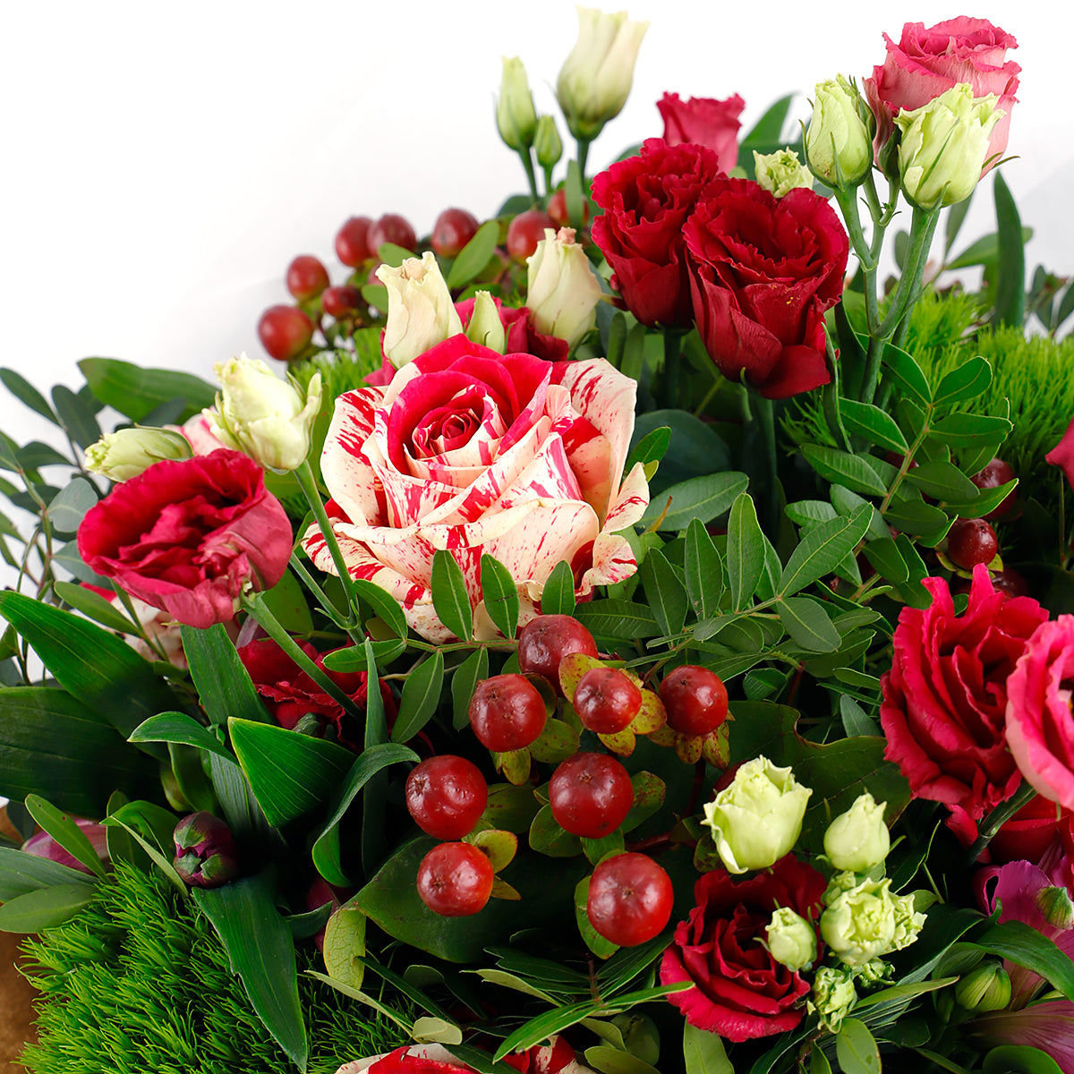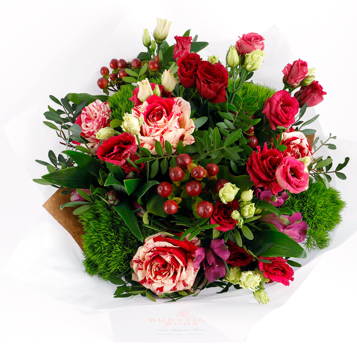 Our exquisite hand-tied bouquet, "Scarlet Jewel." Immerse yourself in the richness of two-tone red roses, lively hypericum berries, graceful alstroemeria, lisianthus blooms, and a touch of vibrant greens. This bouquet is a true masterpiece, effortlessly combining lush textures and deep hues to create a visual delight.