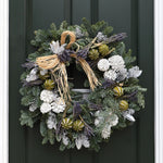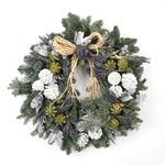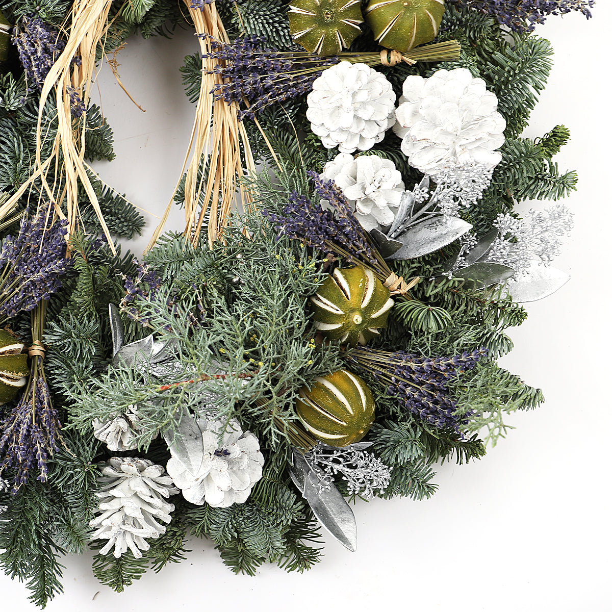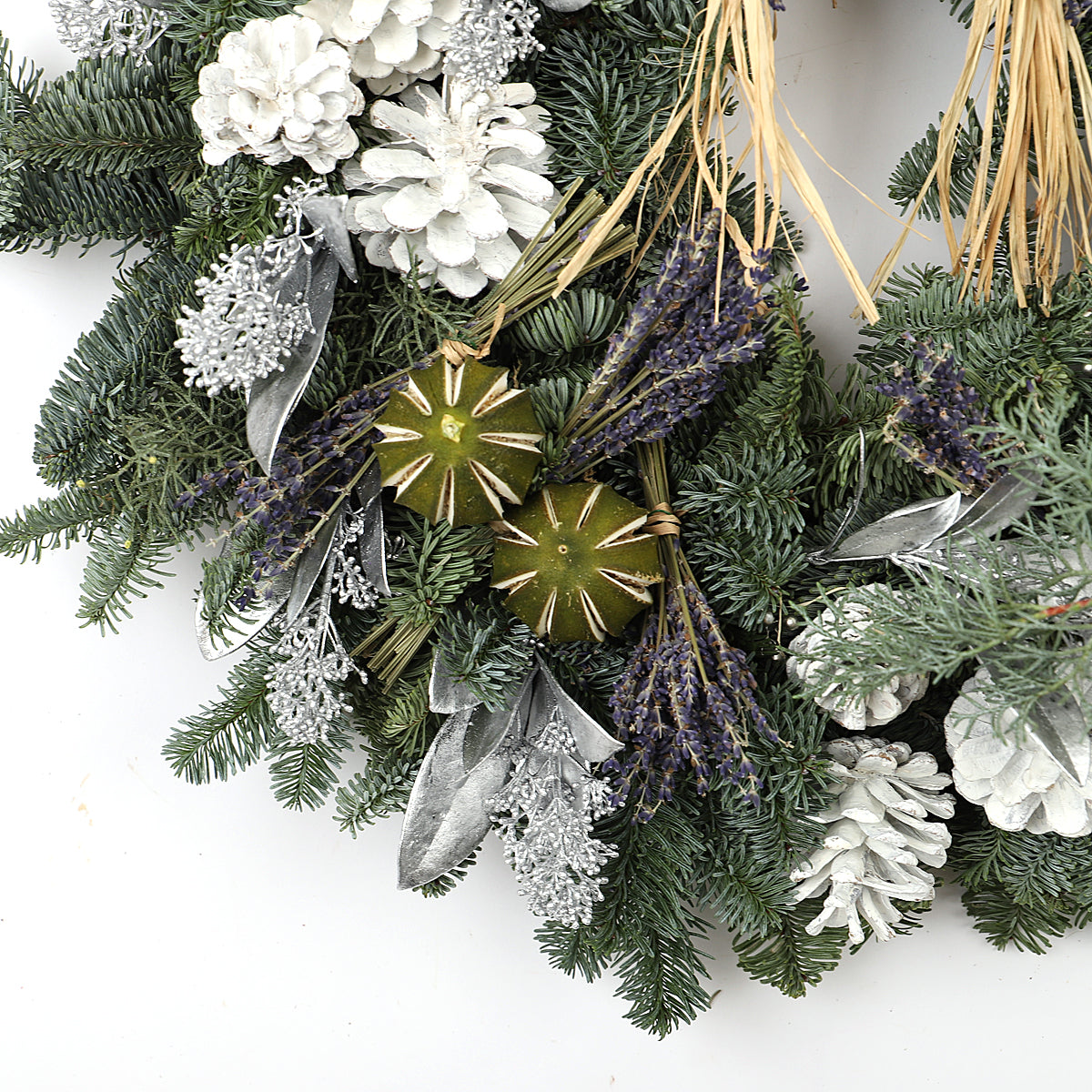 Luxurious handmade Christmas wreath made with fresh Blue pine, white cones, lemons and beautiful naturally dried lavender. Each wreath is made at our store in Holland Park.