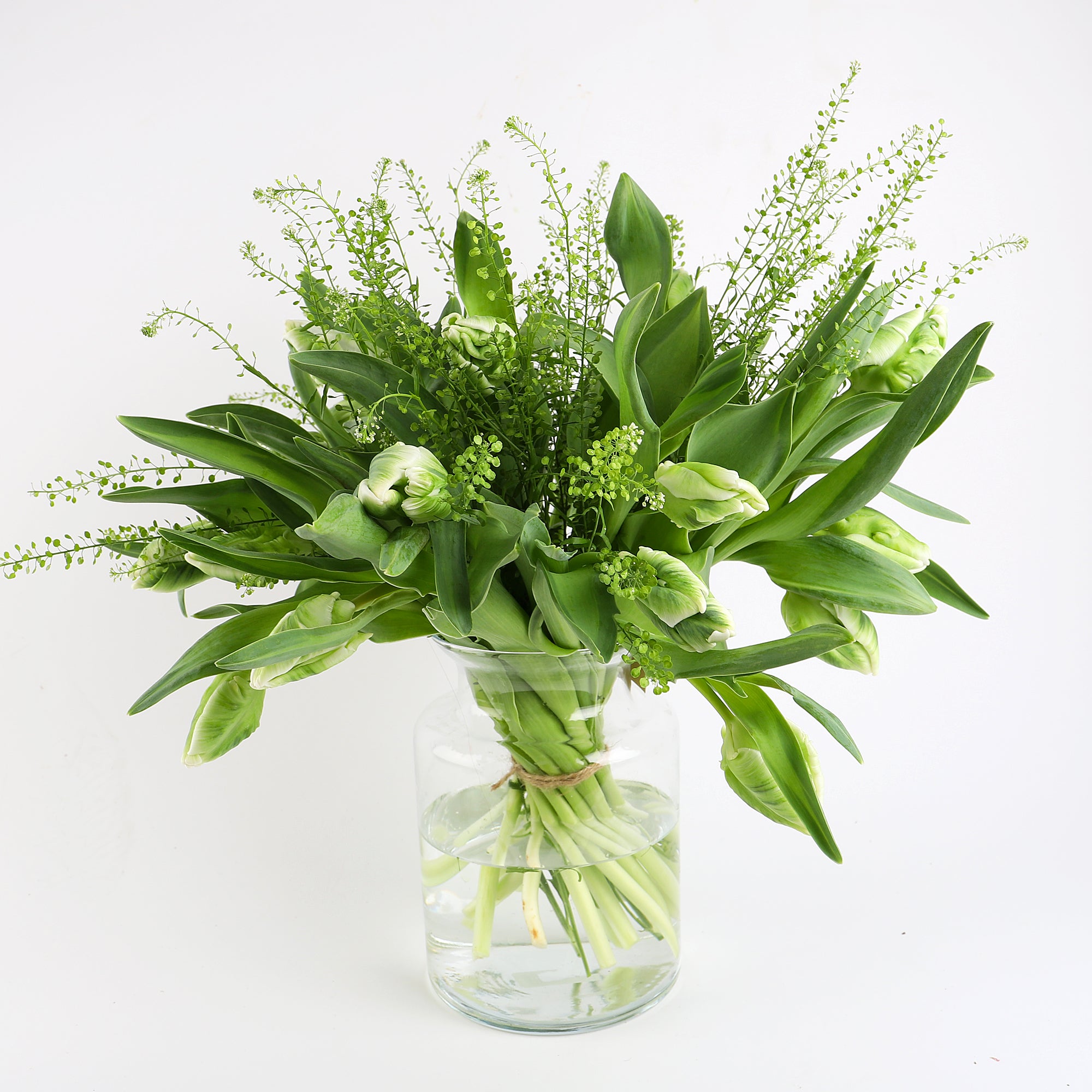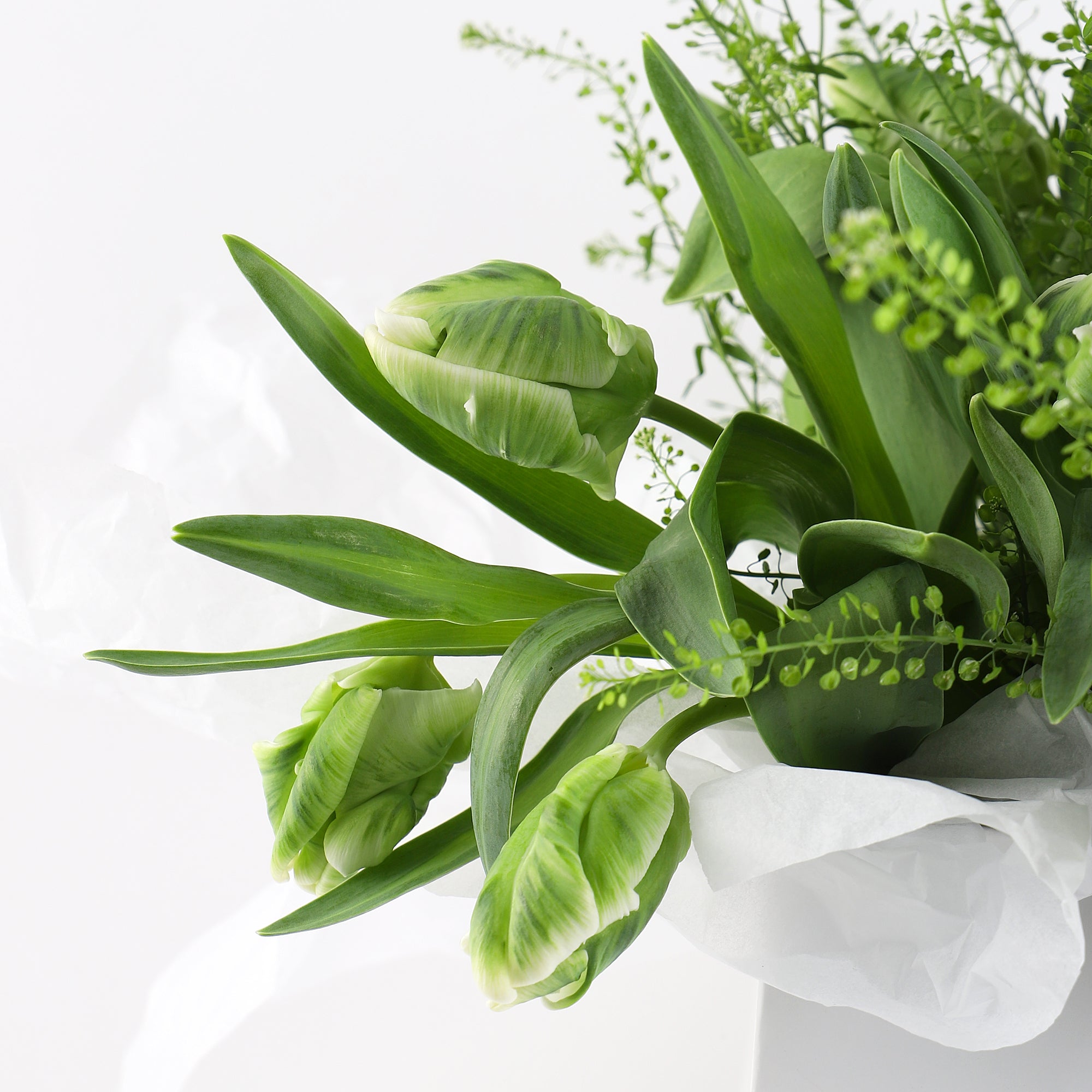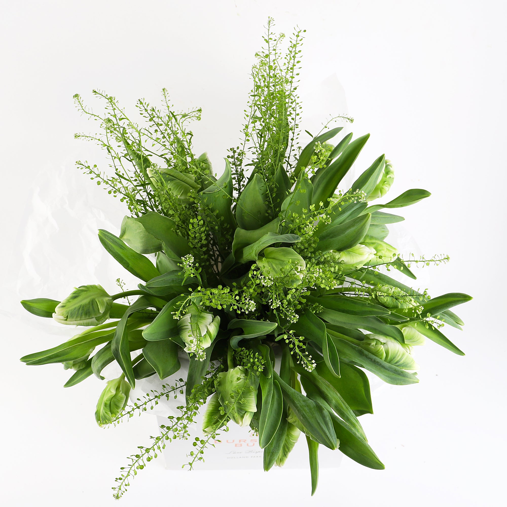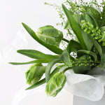 The exquisite parrot tulip takes center stage, its unique fringed petals adding a touch of drama and sophistication. Paired with the whimsical green bell, this arrangement exudes a sense of grace and charm. The pristine white hues create a timeless and captivating display. The White Parrot Tulip bouquet is a symbol of beauty and refinement. Let this bouquet enchant you with its delicate allure and transform your surroundings into a haven of serenity.